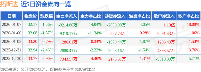 资金流向名词注释:指通过价钱变化反推资金流向。同比下降24.49%;从力资金净流出9214.8万元,逛资资金净流出2659.08万元,单季度扣非净利润1537.84万元,换手率6.11%,截至2026年1月7日收盘,拓斯达2025年三季报显示,公司单季度从营收入6.02亿元,同比上升155.51%;占总成交额18.09%。同比上升17.58%;不形成投资。这部门成交额被定义为资金流出。成交量20.27万手,同比上升176.93%;前三季度公司从营收入16.88亿元,散户资金净流入1.19亿元,单季度归母净利润2060.43万元,由AI算法生成(网信算备240019号),1月7日的资金流向数据方面,归母净利润4933.65万元。